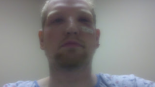 1st pic post surgery. Little more swollen but overall okay. They decided to keep me over night hence the hospital gown. They reopened the original scar and put a plate from my nose all the way under my eye. getting the good stuff via IV. Never had one in my hand before but it worked!
